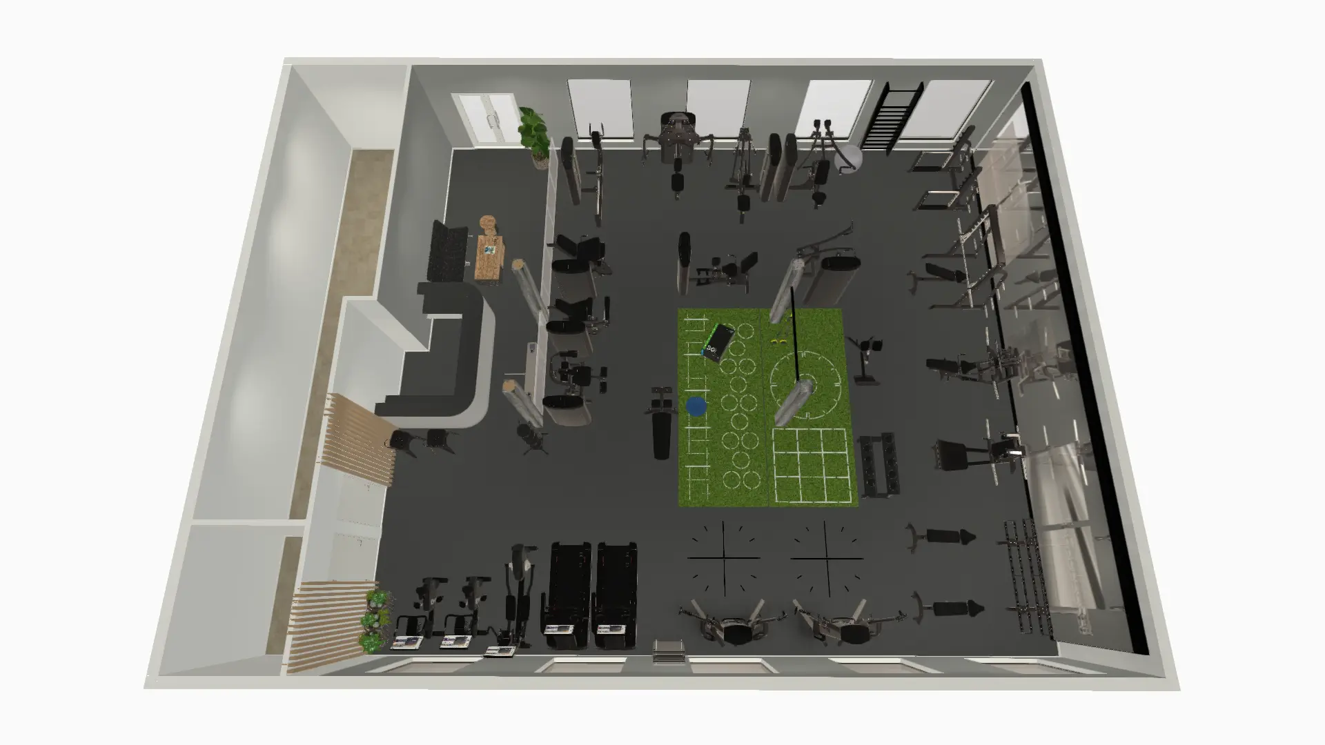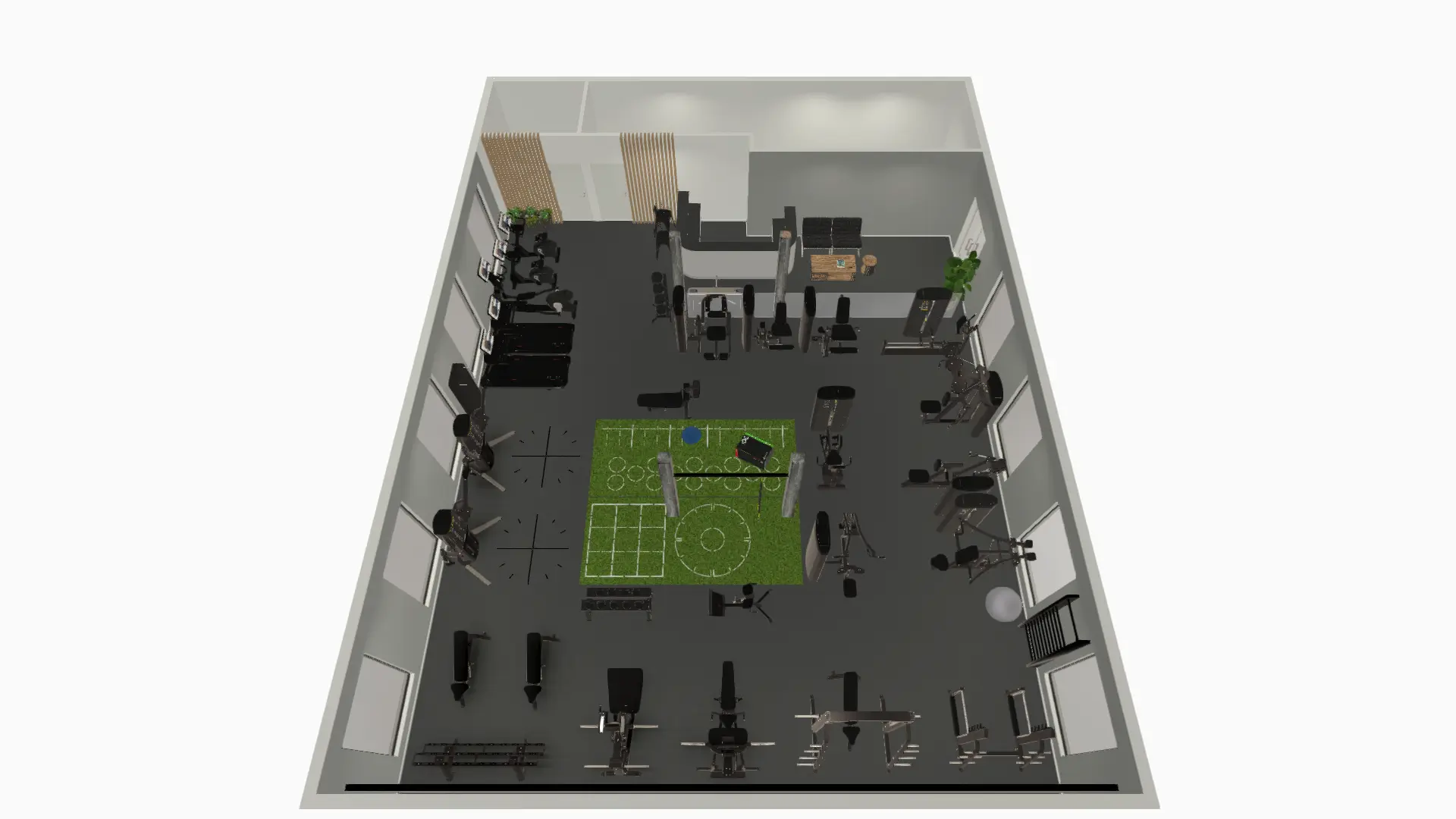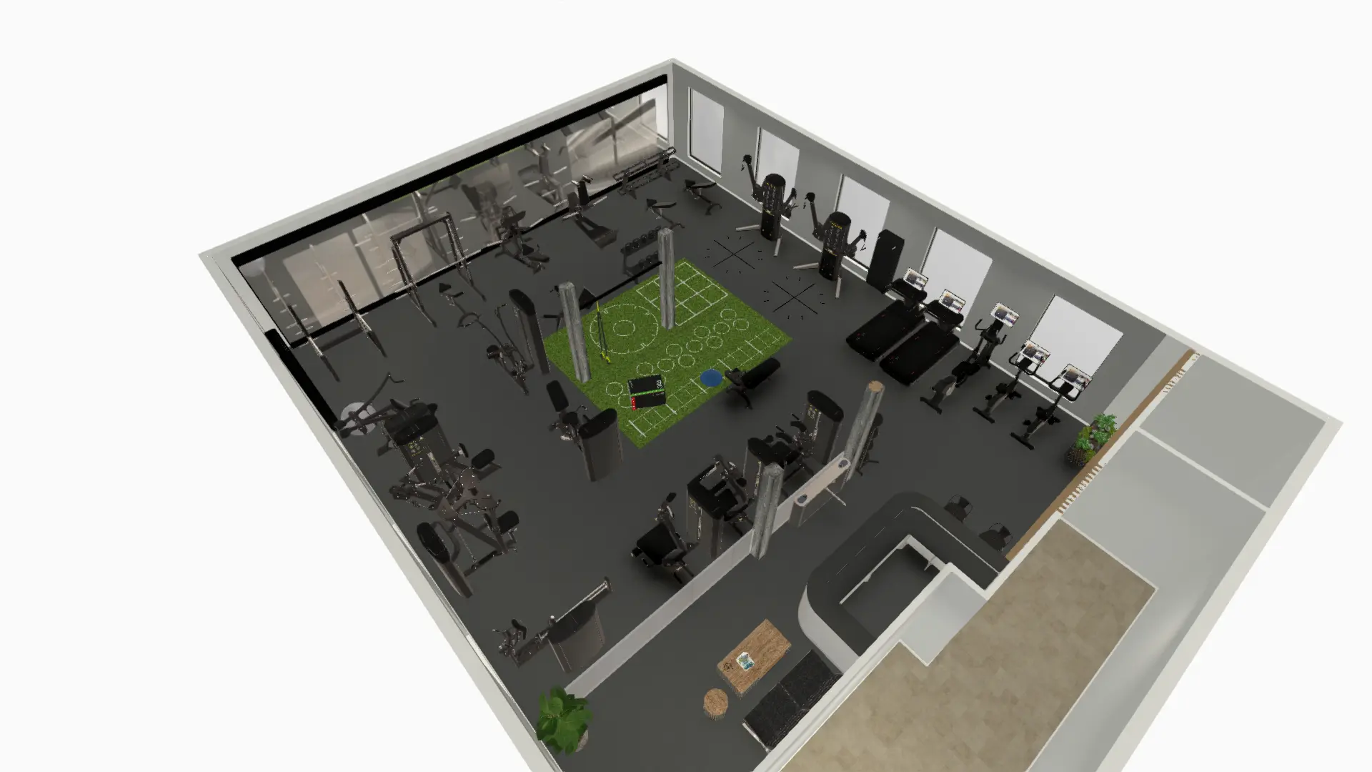 Navrhneme funkční zóny – kardio, síla, funkční trénink, šatny, vstupní zóna apod. Vše s důrazem na efektivitu a ergonomii.
